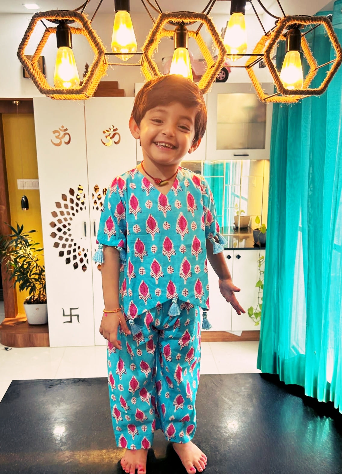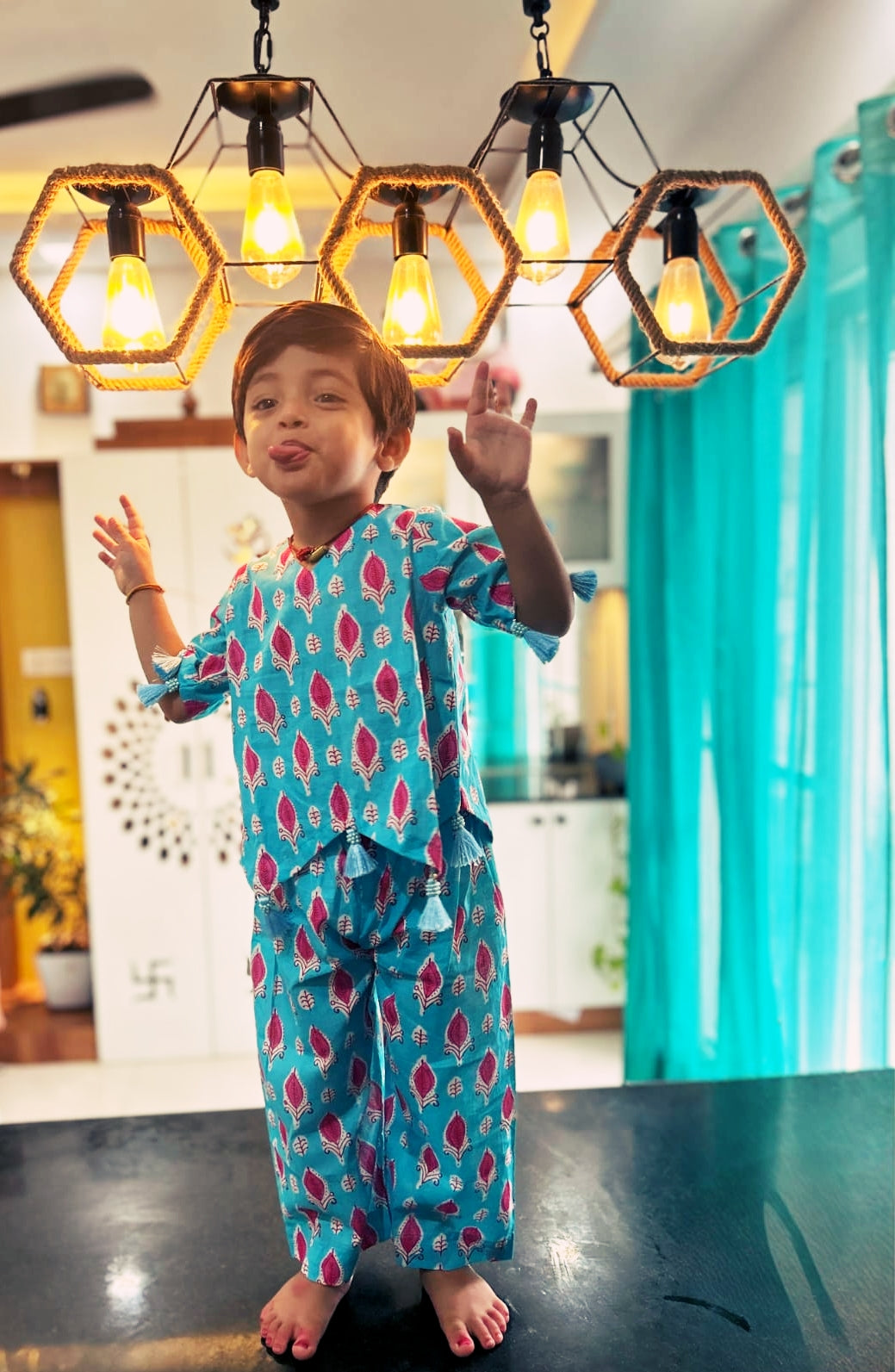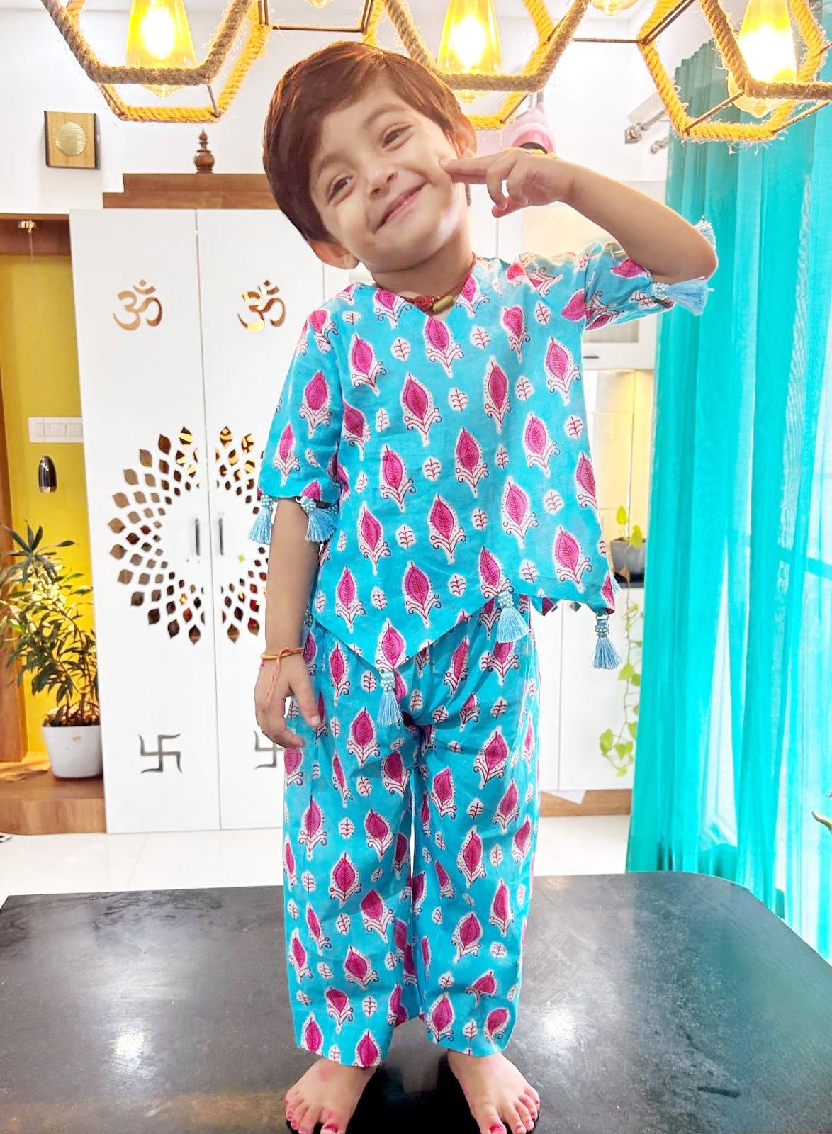 Let your little girl shine in this adorable Jaipuri Print Cotton Tassel Set, crafted from soft and breathable cotton fabric. The outfit features a vibrant handblock-style Jaipuri print in cheerful hues, paired with playful tassel detailing on the sleeves and hemline for a fun, festive look. Designed for both comfort and charm, this outfit is perfect for everyday wear, festive gatherings, or casual celebrations — keeping your princess stylish and comfy all day long.