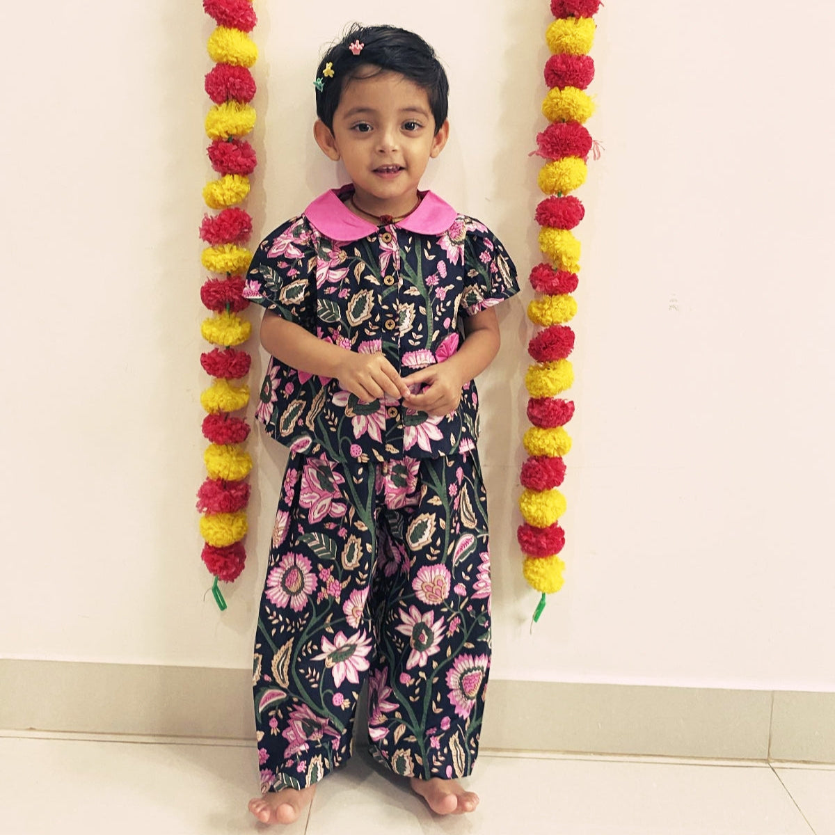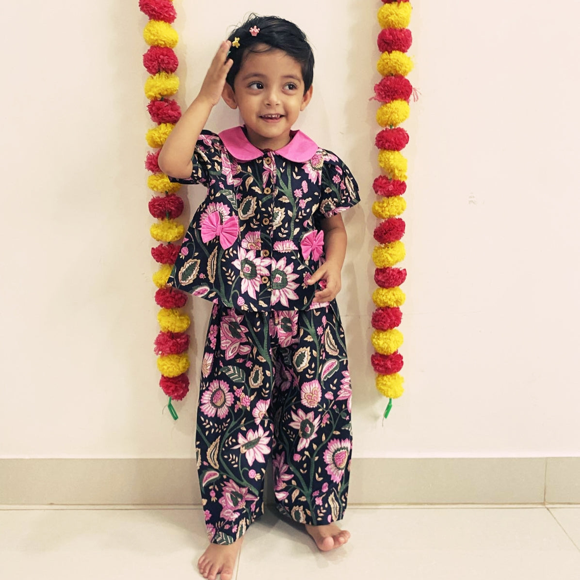 Let your little one shine in this charming baby girl co-ord set, crafted from 100% breathable Jaipuri cotton. The vibrant Black and pink floral print reflects authentic Rajasthani artistry while ensuring all-day comfort.