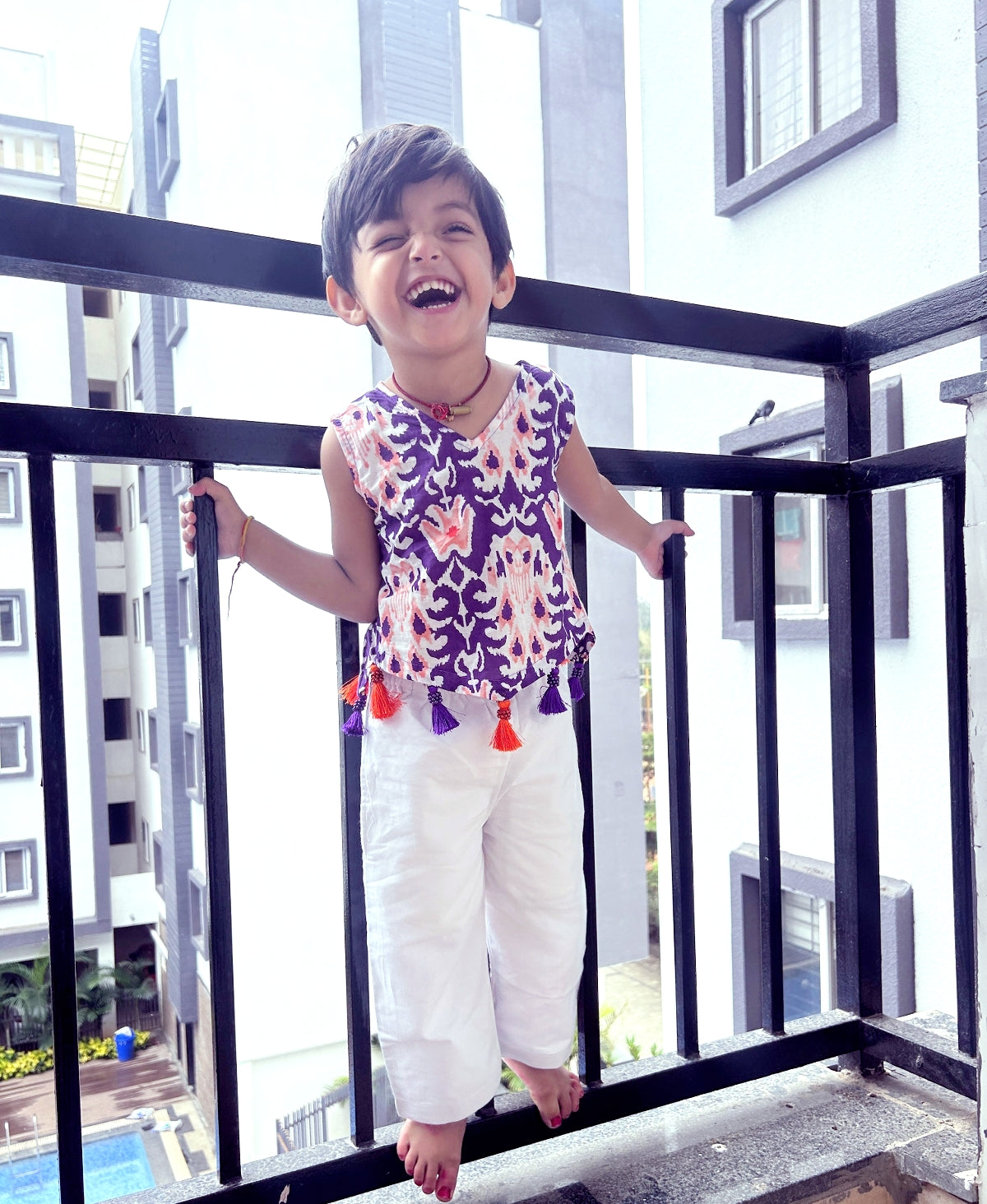 - Purple Jaipuri print top with multicolour tassels for a fun festive look